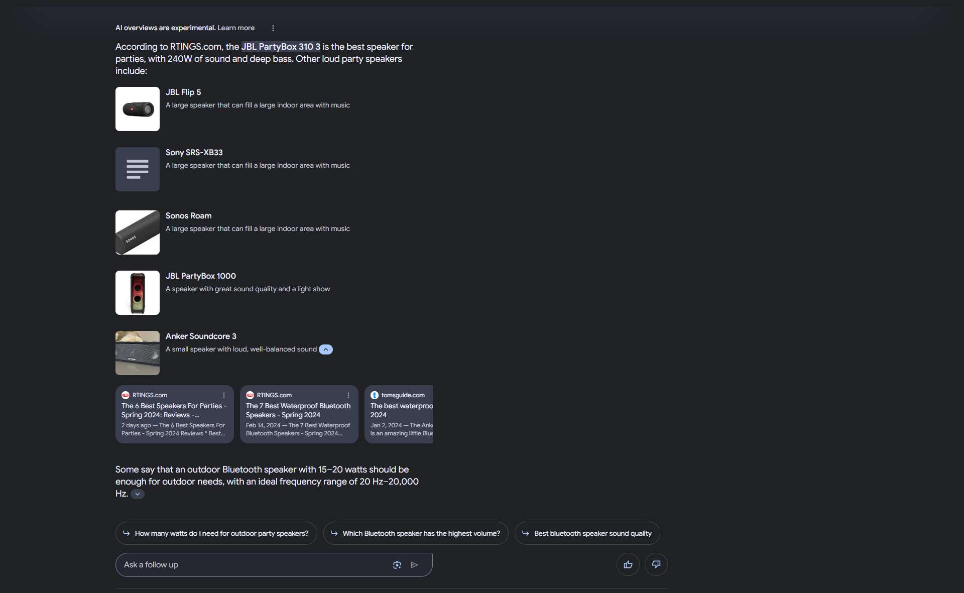 A differenza dei risultati attuali, gli snippet SGE sono più colloquiali e dettagliati. Consentono domande di follow-up naturali senza bisogno di nuove ricerche. I frammenti si adattano al volo, continuando il dialogo citando le fonti.